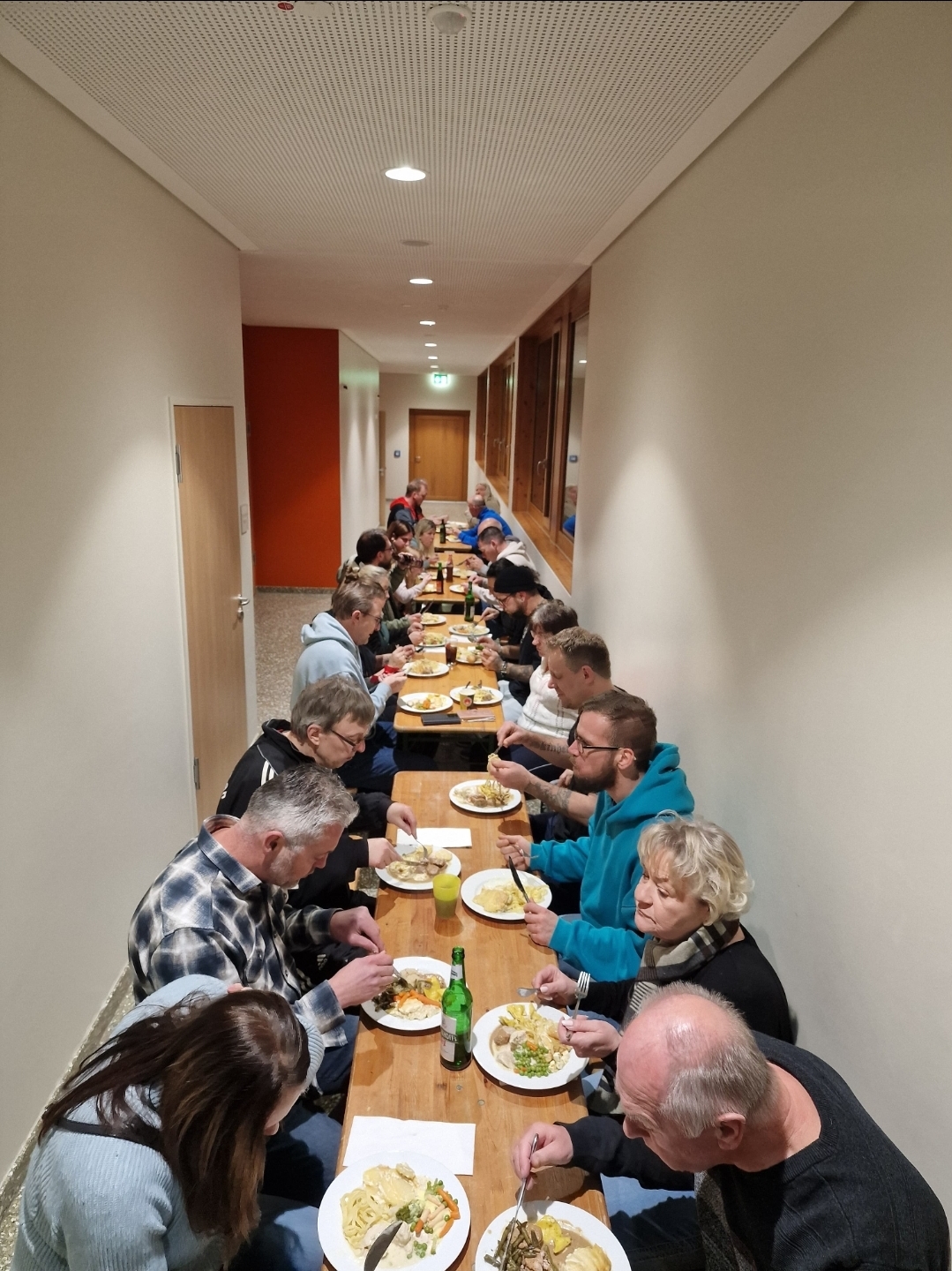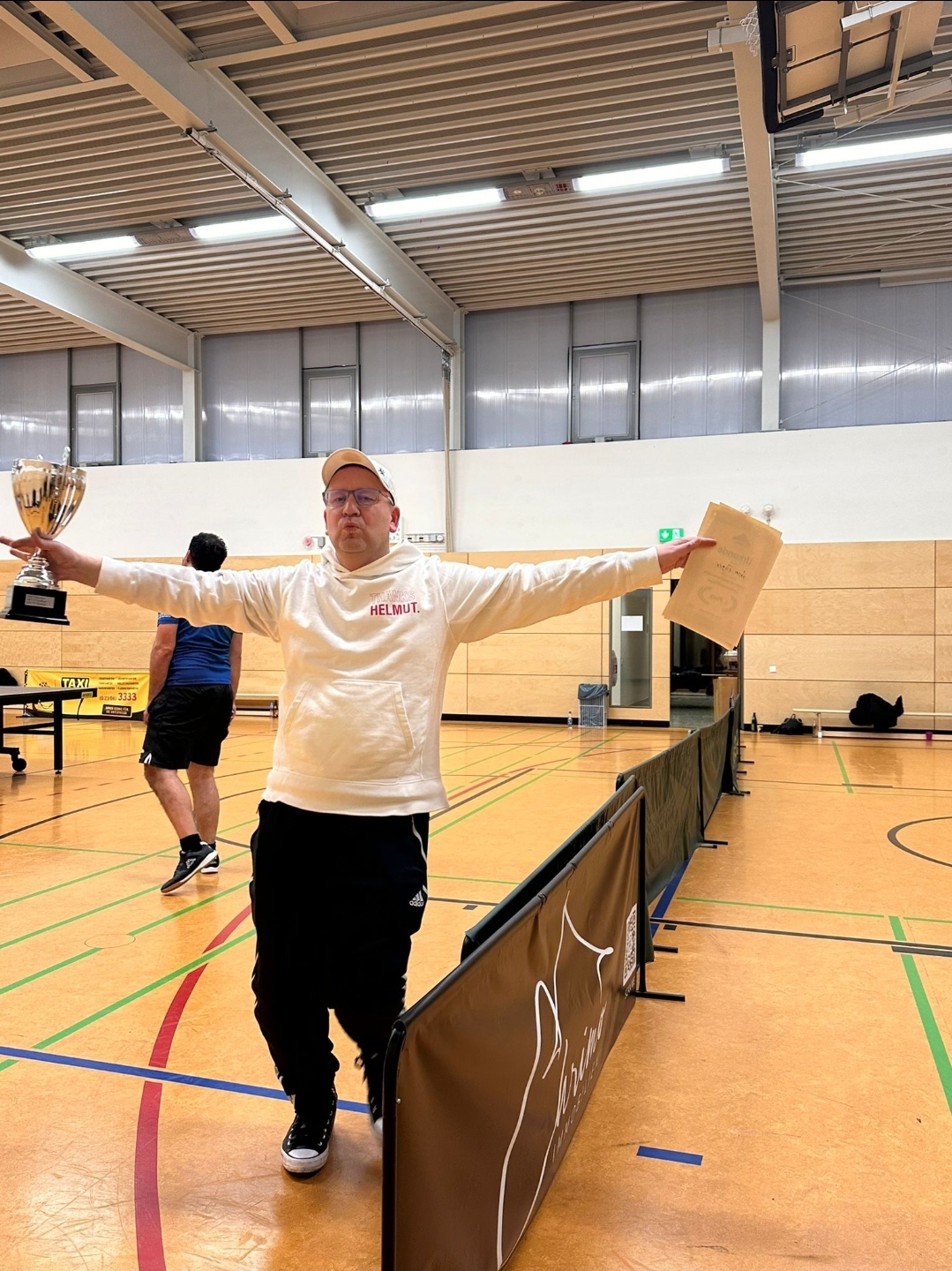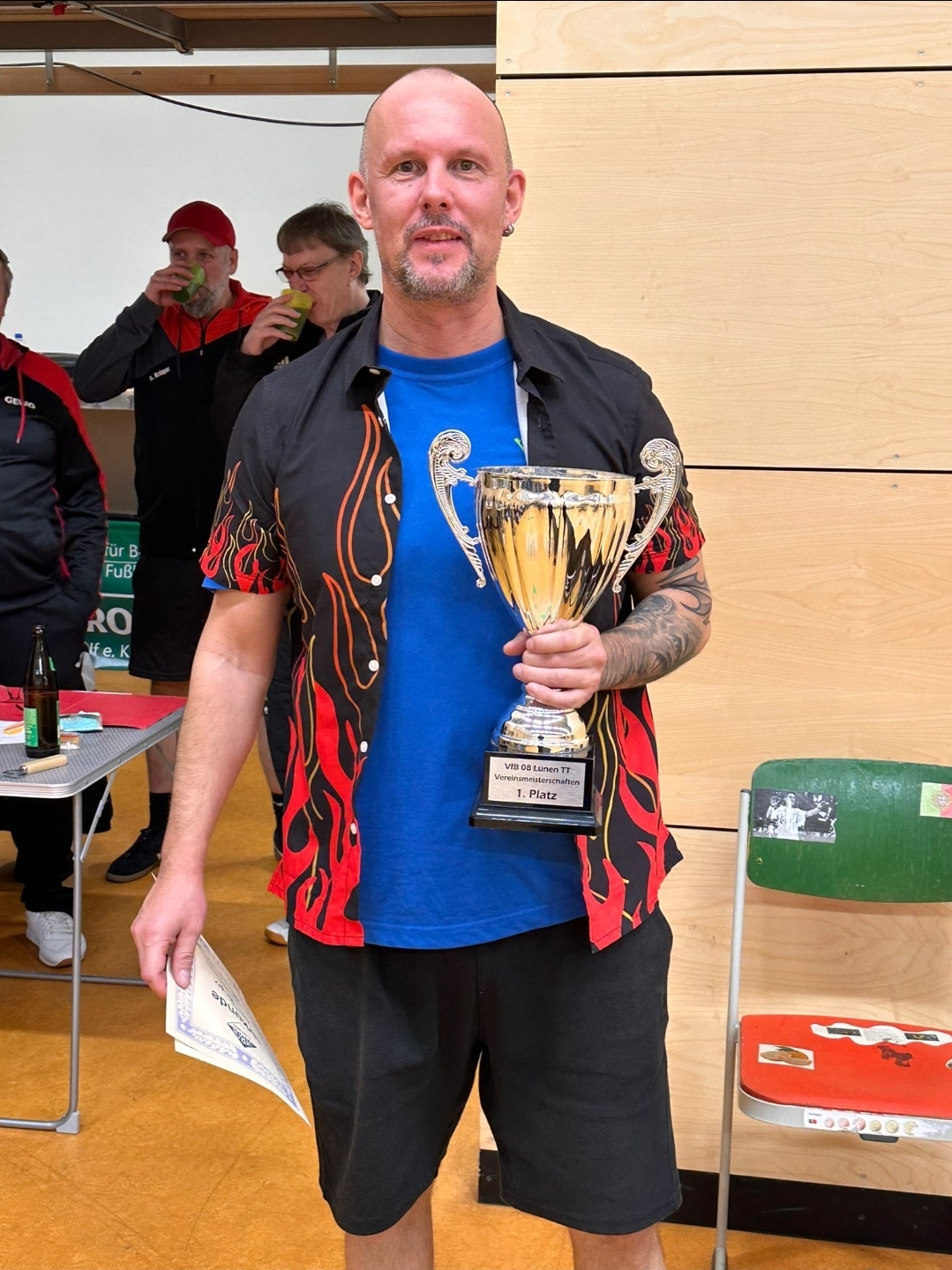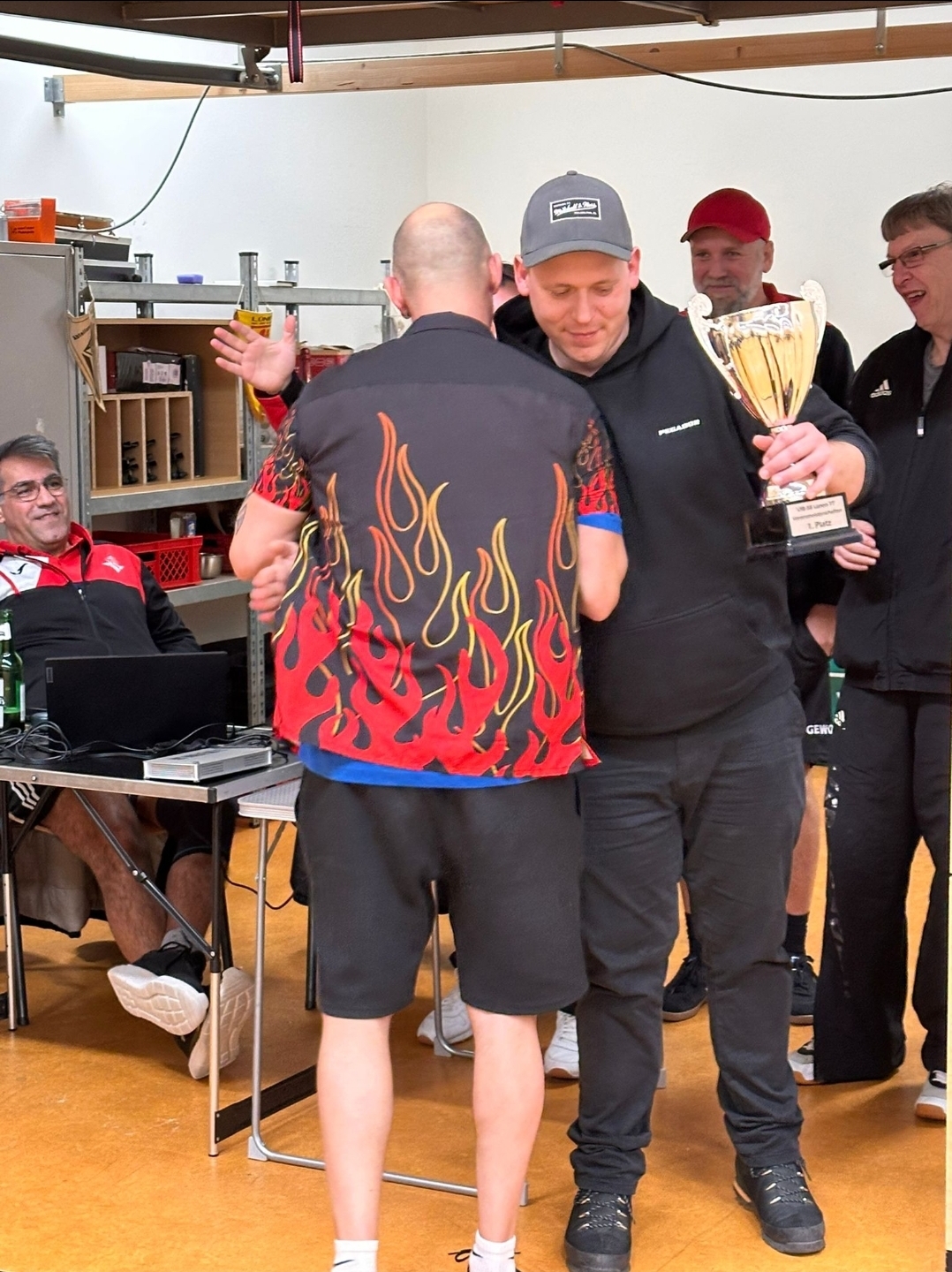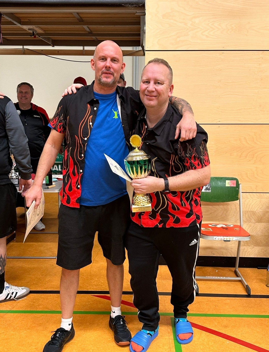 Unsere 1.Mannschaft fand sich im Halbfinale wieder und wie jedes Jahr gab es die Konstellation, dass unsere beiden Youngsters und Sonnenscheine Marcel Amanat und Leon Gössing ein Spektakel boten. Vor ausverkauftem Haus zeigten beide, was sie beim VfB gelernt haben, und rissen somit die Zuschauer zum Teil von den Hockern. Am Ende muss es leider einen Verlierer geben. Marcel setzte sich durch und zog zum dritten Mal in Folge ins Endspiel. Der Gegner wurde beim Frührentnertreff zwischen Martin Wertessen und Sven Berger ausgespielt. Auch die beiden Oldies zeigten ihr ganzes Können und zeigten der Halle, wo der Hase lang läuft. Unter dem Klang der Noppen und glatten Belägen gab es spektakuläre Ballwechsel und auch hier kamen die Zuschauer auf Ihre kosten. Aber auch hier konnte es nur einen Sieger geben, Sven Berger spielte seine ganze Routine aus und setzte sich gegen Martin durch. Nicht nur im Finale, auch in den vorherigen Spielen, zeigte Sven, dass er durchaus schon in anderen Ligen unterwegs war und ließ dem aufopferungsvollen Marcel, der immer wieder kämpfte wie die Kesselflicker aus Lünen-Süd, kaum eine Chance und somit gab es an diesem Tag nur einen Sieger. Glückwunsch Sven, hast du verdient gewonnen! Im Doppel gab es mitunter wilde Konstellationen, der Spaß kam hier definitiv nicht zu kurz 😊 Im Finale spielten Andre Firchow / Dennis Eichfeld gegen Sven Berger / Andre Frank. Sven und Andre machten kurzen Prozess und sicherten sich verdient den Pokal. Die Federführung in diesem Gewinnerdoppel übernahm natürlich unser Käpt`n der 5.Mannschaft, Andre Frank. Er glänzte nicht nur in seinem feurigen Trikot, sondern auch an der Platte, Hut ab, habt ihr gut gemacht! Insgesamt haben wir wieder einmal hochklassige, rassige und freudige Spiele gesehen. Wir wären aber nicht wir, wenn wir den Abend nicht standesgemäß ausklingen lassen würden. Dave hat sich nicht lumpen lassen und den gesamten VfB bekocht…ääh bekochen lassen 😉 natürlich gab es auch die ein oder andere Kaltschale, Spiel- und Mikrospaß mit Payman 😊, sodass die TT-Abteilung des VfB den Abend hat locker ausklingen lassen. Im Namen des Vorstands bedanken wir uns bei allen Beteiligten für eine rundum gelungene Veranstaltung, wir hatten unsererseits eine Menge Spaß, es ist immer wieder schön, wenn die VfB-Familie zusammenkommt und wir ein wenig zusammen auf den Putz hauen können. DANKE!!!